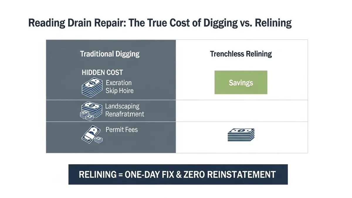 If you wait until the pipe collapses, the cost jumps from a standard £600–£1,200 relining job to a full-scale excavation that can easily exceed £3,000-£5,000, especially if we have to navigate utility lines or reinstate expensive landscaping near Forbury Gardens.